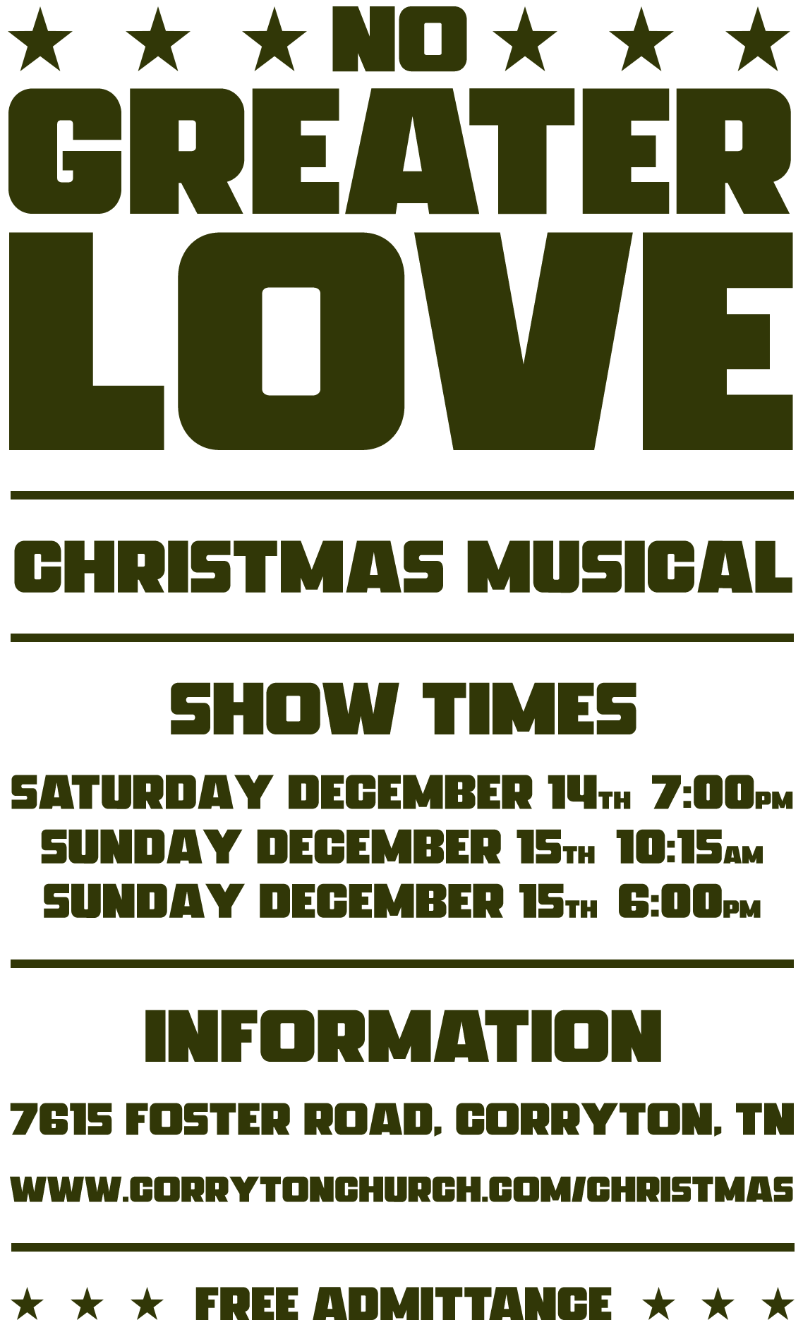 Join us this December for No Greater Love, a Christmas musical at Corryton Church. Set to the music and spirit of Christmas in 1944—two soldiers forge an unlikely bond on the battlefield, discovering faith, friendship, and the power of hope that resonates far beyond the war. Come witness a story of friendship, faith, and the Christmas spirit—told through song, dance, and the echoes of wartime courage. With friendship as their refuge and faith as their guide, two soldiers discover the heart of Christmas in a world at war.